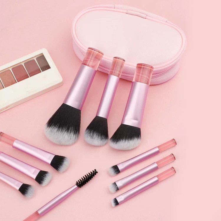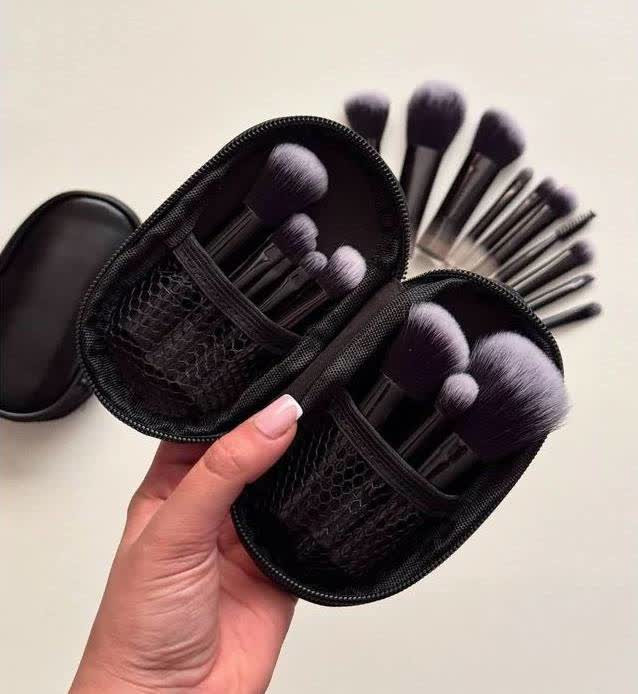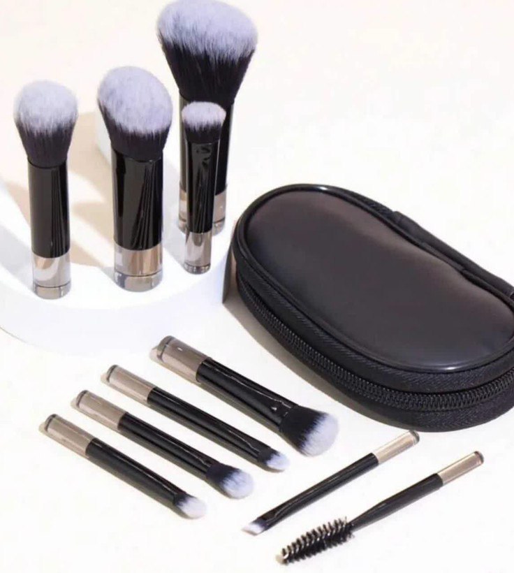ست براش 10 تکه کیفی تراول سایز مینی شین سایز شامل یک کیف مسافرتی و 10 براش برای استفاده با کانسیلر، کرم پودر، رژگونه، کانتور، سایه چشم، پنکیک ، پودر فیکس و یک اسپولی برای ابرو و مژه است .